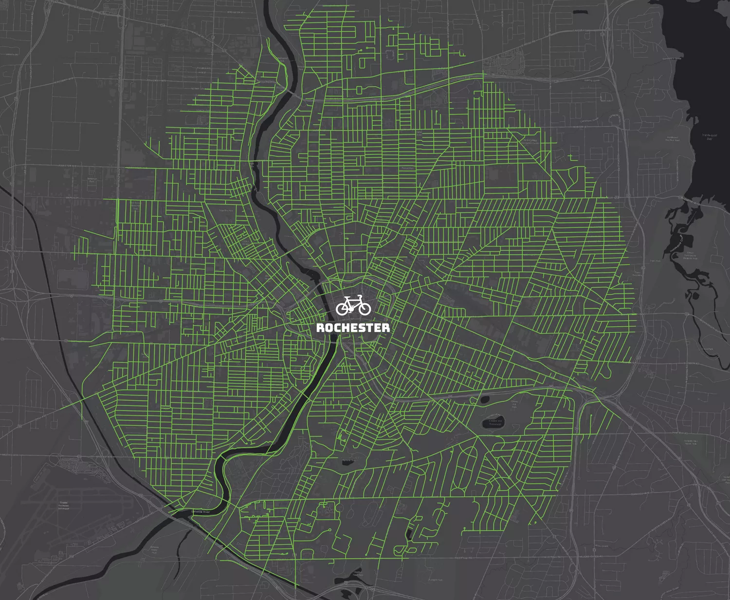 So far, the organization has released maps for downtown Rochester, Irondequoit, and Pittsford. More are on the way, with Brighton, University of Rochester Medical Center and River Campus, and Rochester General Hospital on deck. Each map displays a geographic area in gray, with its road networks highlighted in green to show how far a typical bicyclist can get in 20 minutes.